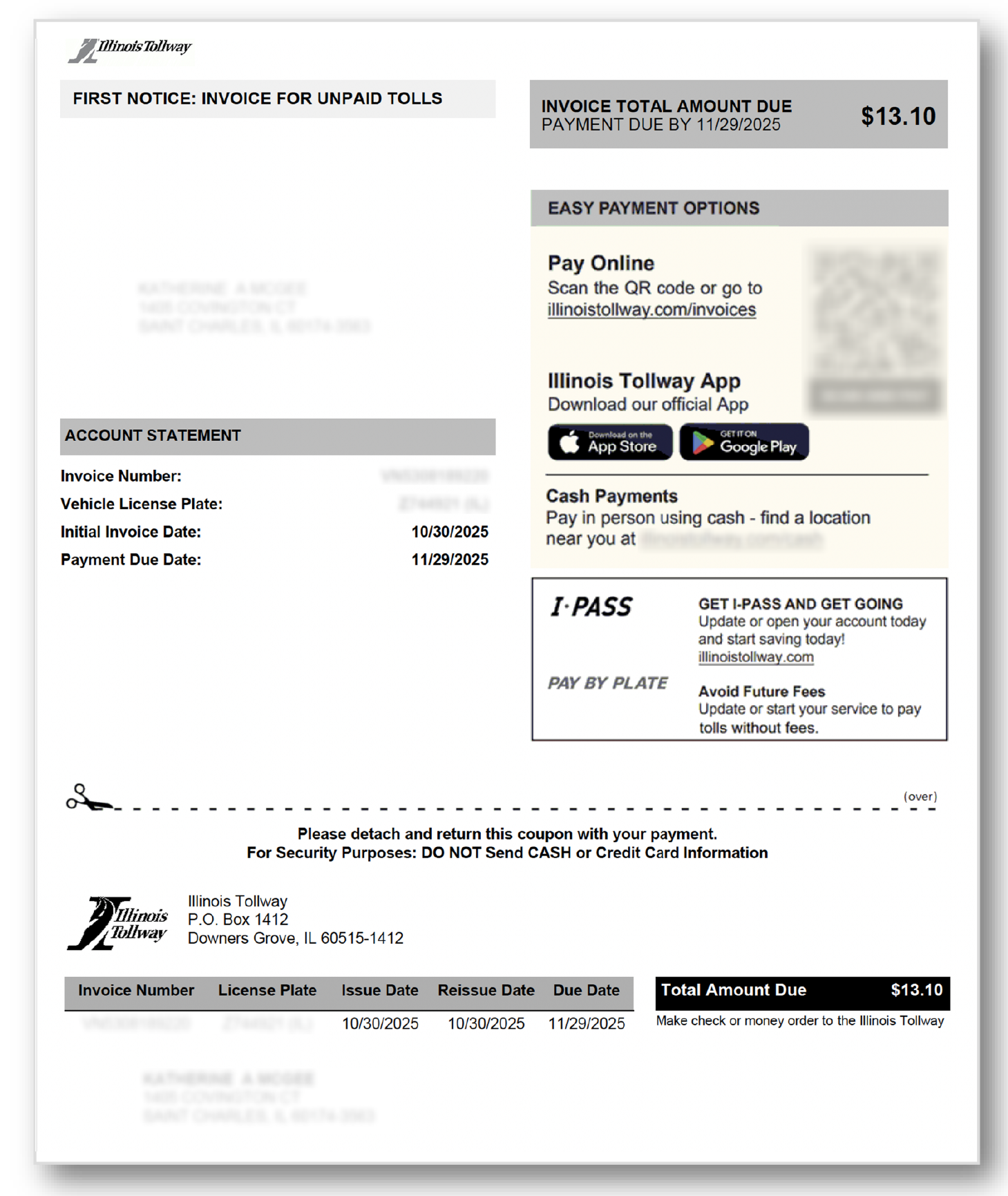 When an unpaid toll isn’t paid online, the Illinois Tollway will mail the customer a series of invoices providing multiple opportunities to address unpaid tolls and avoid entering the violation process. Invoices will be sent via U.S. Mail and will include an invoicing fee for each unpaid toll.