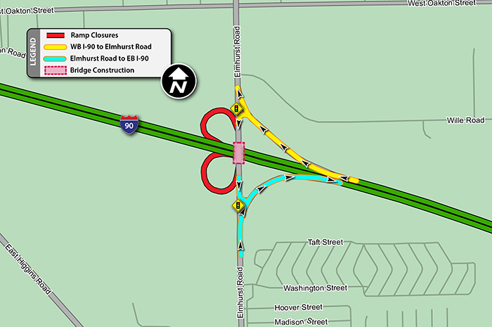 New bridges and ramps will be constructed at the interchange to provide full access between I-90 and Elmhurst Road. The current interchange at Elmhurst Road and I-90 is a partial interchange providing westbound exit and eastbound entrance access only. These ramps were built in 1958 as part of the original construction of I-90.