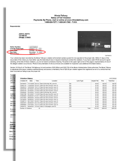 A Notice of Toll Violation will come in the mail and include a photo of one of the violation events that the Illinois Tollway has on record, as well as details of the date, time and location of each violation event.